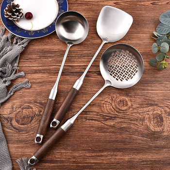 All'ingrosso Set di stoviglie in acciaio inox SUS304 con manico in noce cucchiaio forato utensili da cucina colino al pepe di Sichuan